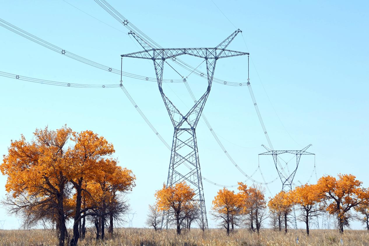 2025年10月,新疆且末县的民丰-且末-若羌750千伏输电线路工程跨越胡杨林。(国家电网供图 央广网发)